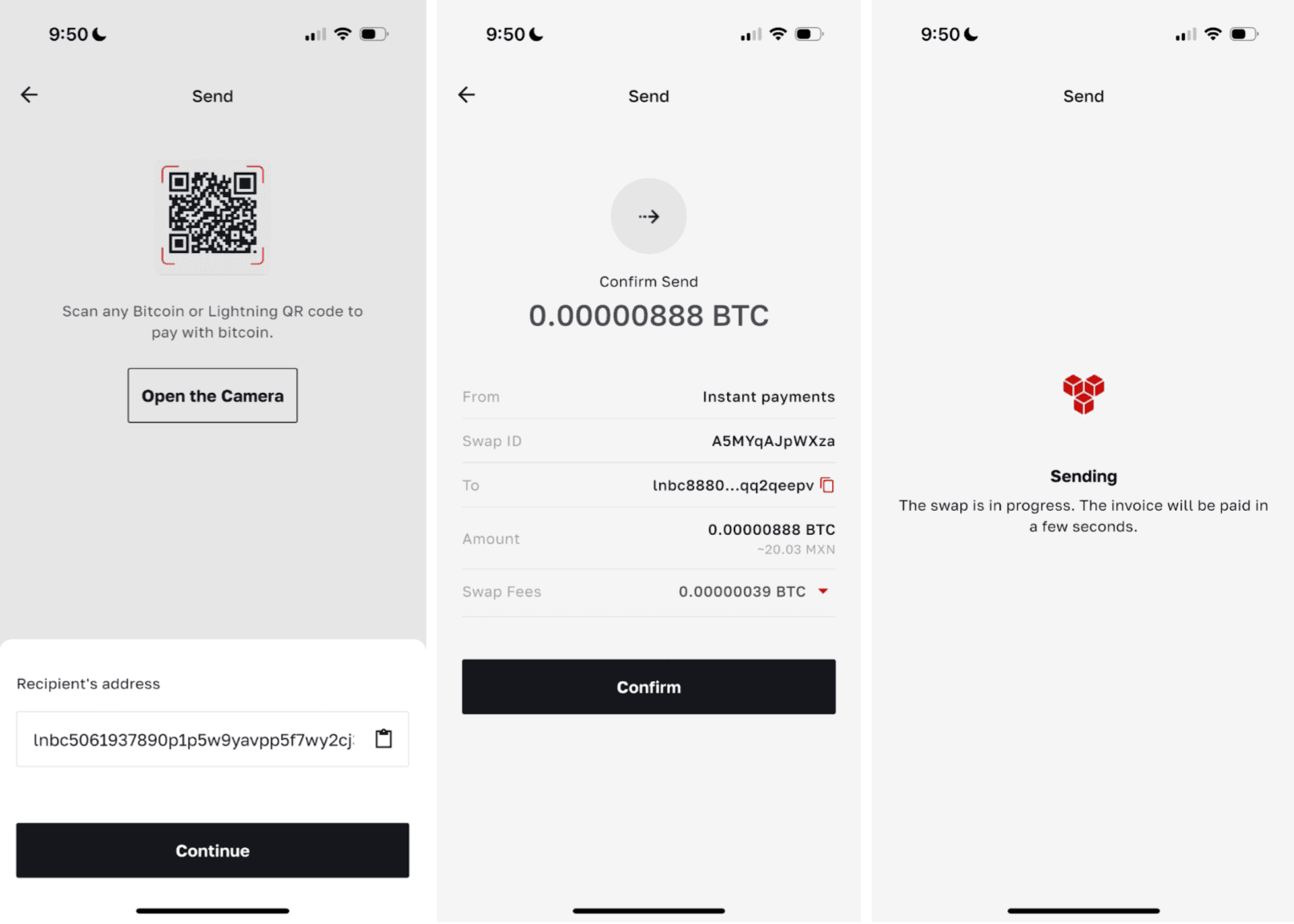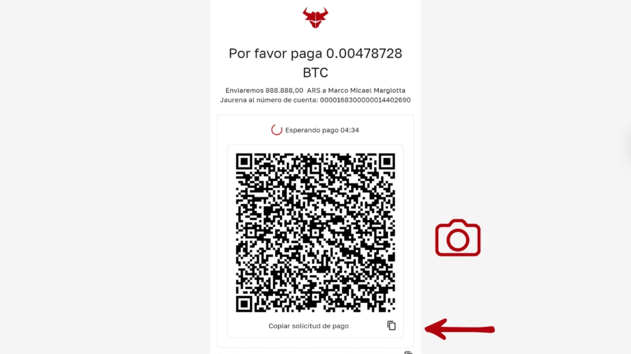 Te generamos una solicitud de pago. Si puedes escanear el QR desde tu cartera de bitcoin, escaneas, checas que los detalles estén correctos y confirmas la transacción.
